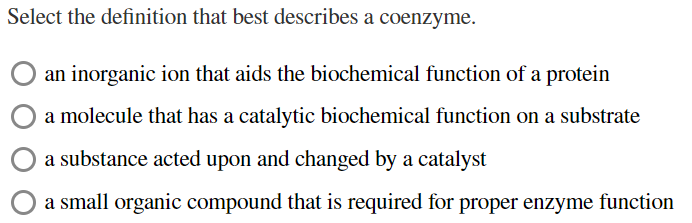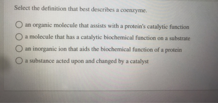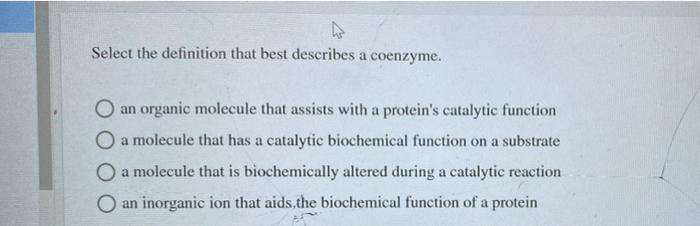 An organic molecule that assists with a proteins catalytic function O a molecule that has a catalytic biochemical function on a substrate O a molecule that is biochemically altered during a catalytic reaction O an inorganic ion that aids. Enzymes are proteins that speed up chemical reactions and often require cofactors to function. A coenzyme cannot function alone but can be reused several times when paired with an enzyme.